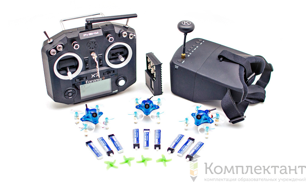 Образовательный набор состоит из восьми готовых к полёту современных мини-дронов, а также комплекта стандартизированных элементов полосы препятствий. Включает электронные версии учебных материалов, набор запчастей, все необходимые инструменты и симулятор для тренировки навыков управления квадрокоптером.
