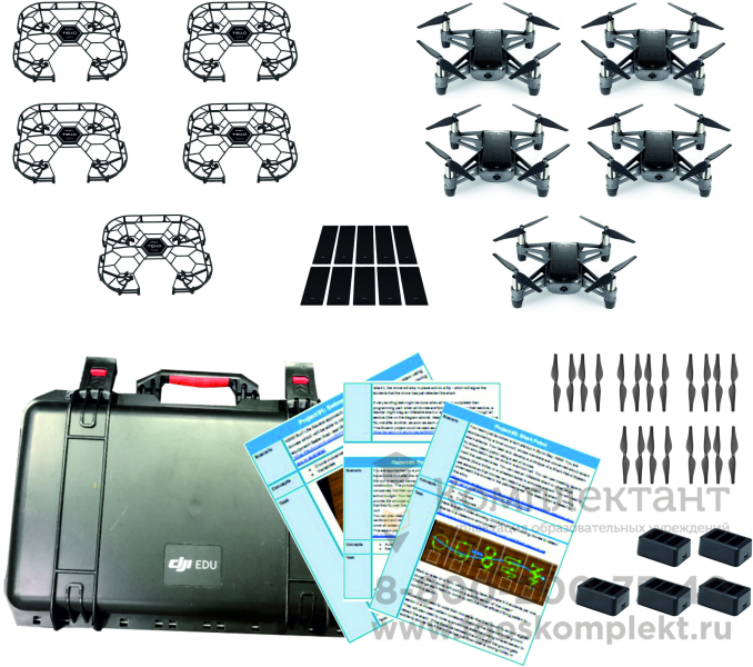 Комплект квадрокоптеров – это набор из 5 дронов от компании Tello EDU, которыми можно управлять как поодиночке, так и организованной группой. Это небольшие, но функциональные дроны, с помощью которых можно научиться пилотировать летательным аппаратом, а также постигнуть базовые принципы программирования на языке Pyhton.В комплект входят квадрокоптеры с защитой для винтов, руководство по эксплуатации с детальным описанием последовательности действий, а также 10 уроков по программированию на языке Pyhton, с помощью которых любой пользователь сможет научиться создавать базовые коды для управления дронами.