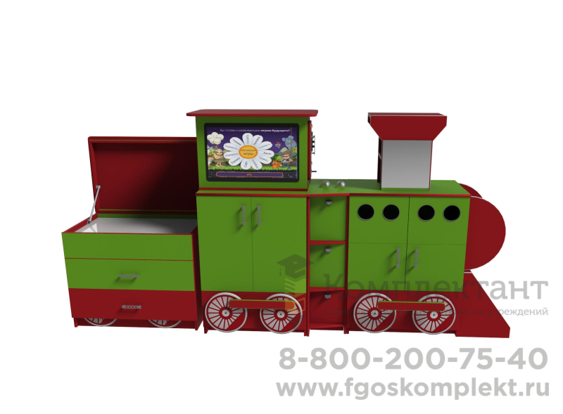 Оборудование представлено в необычном формате: в виде паровозика с выдвижными ящиками, шкафчиками, интерактивным планшетом, зеркалами для отработки мимики, беспроводной радио системой на 2 микрофона и песочным столом. Для взаимодействия с мультимедийным комплексом имеется клавиатура и мышь. Для подключения дополнительных источников в наличии кабели HDMI и Usb 2.0.