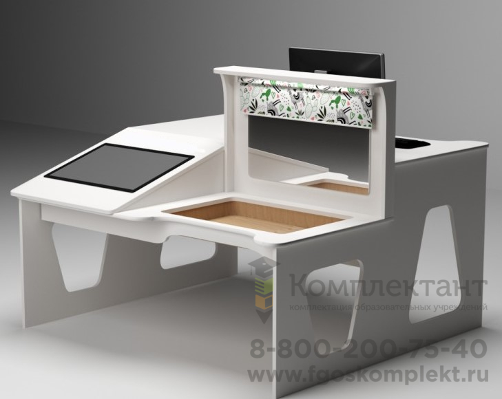 Предлагаемое ПО позволяет подбирать материал разной степени сложности в соответствии со способностями особого ребенка. ПО зарегистрировано в Едином реестре российских программ Минкомсвязи, что дает возможность использовать его во всех образовательных организациях. Логопедический стол состоит из двух рабочих мест – ученика и педагога, это позволяет продуктивно вести занятия и контролировать выполнение ребенком заданий. Современные ПК сделают этот процесс быстрым и производительным. Также в комплект входит: