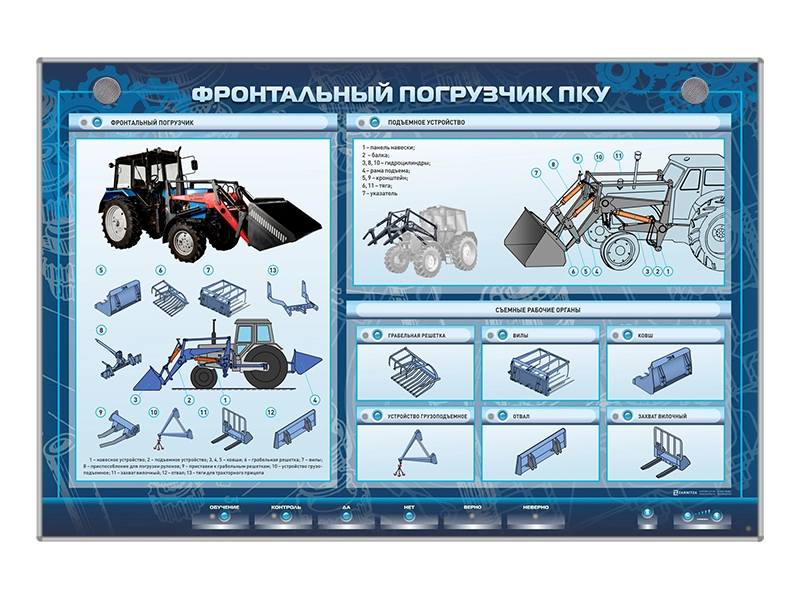 Электрифицированный стенд представляет собой информационную панель с раздельной световой индикацией. На стенде представлена иллюстрированная информация о фронтальном погрузчике ПКУ.