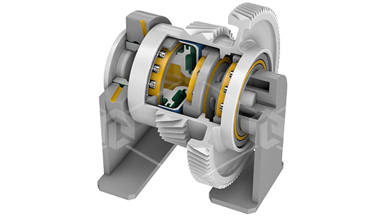 Данная разрезная модель измерителя крутящего момента представляет собой редуктор с винтовой зубчатой передачей, использующий осевое усилие, создаваемое на промежуточной передаче для измерения крутящего момента.