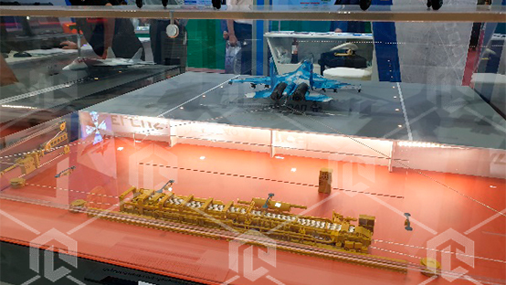 Макет комплекса устройств аэрофинишера, выполнен из пластика с прозрачными окнами для визуализации внутреннего строения и состава устройства. Макет включает в себя часть палубы авианесущего крейсера, а также имитатор самолета, заходящего на посадку. Макет установлен на подмакетнике и имеет световую индикацию исполнительных механизмов.