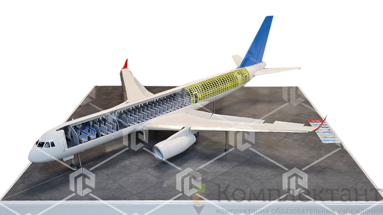 Данный учебный комплекс позволяет с помощью действующего физического макета изучить внешнее и внутреннее устройство самолёта. На макете представлена часть силового каркаса состоящая из шпангоутов и стрингеров. На модели можно реализовать механизацию рулей самолёта, а также показать расположение электрических, топливных, пневматических магистралей. Кроме того, можно показать внутреннее убранство объекта, а также расположение различных блоков, не видимых на макете с обшивкой.