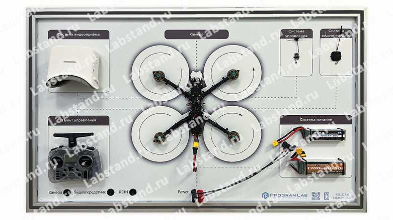 Данный комплекс представляет из себя интерактивный физический стенд, на котором жестко закреплен действующий образец изучаемого прототипа БПЛА мультироторного типа FPV-класса, с размером рамы 5-7 дюймов. Все электрические связи между узлами модели выполнены в виде штырьковых разъемных соединений и могут быть разъединены в любой момент для сборки другой конфигурации. С помощью данного комплекса реализуется процесс обучения устройству основных систем, компоновки, электроники и электрических связей БПЛА FPV-типа. Комплекс предоставляет возможность произвести исследование конструкции и особенностей строения электрических систем типовых FPV-дронов мультироторного типа, осуществлять монтаж-демонтаж элементов и отрабатывать навыки базового обслуживания и подготовки к запуску FPV аппаратов.