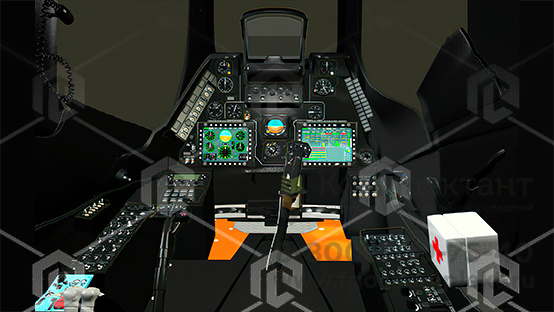 На лицевой стороне размещены приборные доски экипажа вертолета Ми-28НЭ, которые соответствуют реальной и позволяют разместить необходимые органы управления и индикации (МФИ-10-7В или имитации МФИ полностью соответствующей реальным).