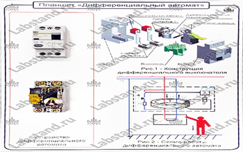 На лицевой панели планшета размещены изображения типовых схем подключения коммутатора, изображения принципов работы и конструкции, а так же установлены разрезы натуральных деталей и функциональных элементов реального дифференциального автомата.
