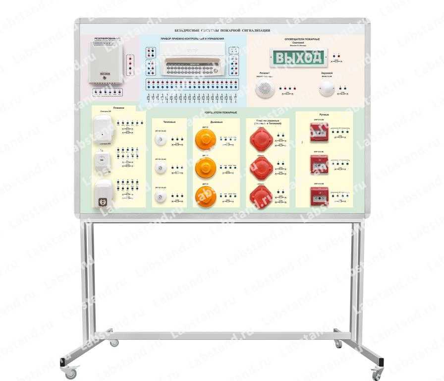 Стенд предназначен для изучения и тестирования систем оперативного мониторинга факторов наличия пожара (дым, температура, инфракрасное и ультрафиолетовое излучение, угарный газ) и оповещения в случае превышения допустимых норм; проведения лабораторно-практических занятий по изучению работы безадресных систем пожарной сигнализации и оповещения, сборке и тестированию типовых схем включения оборудования.