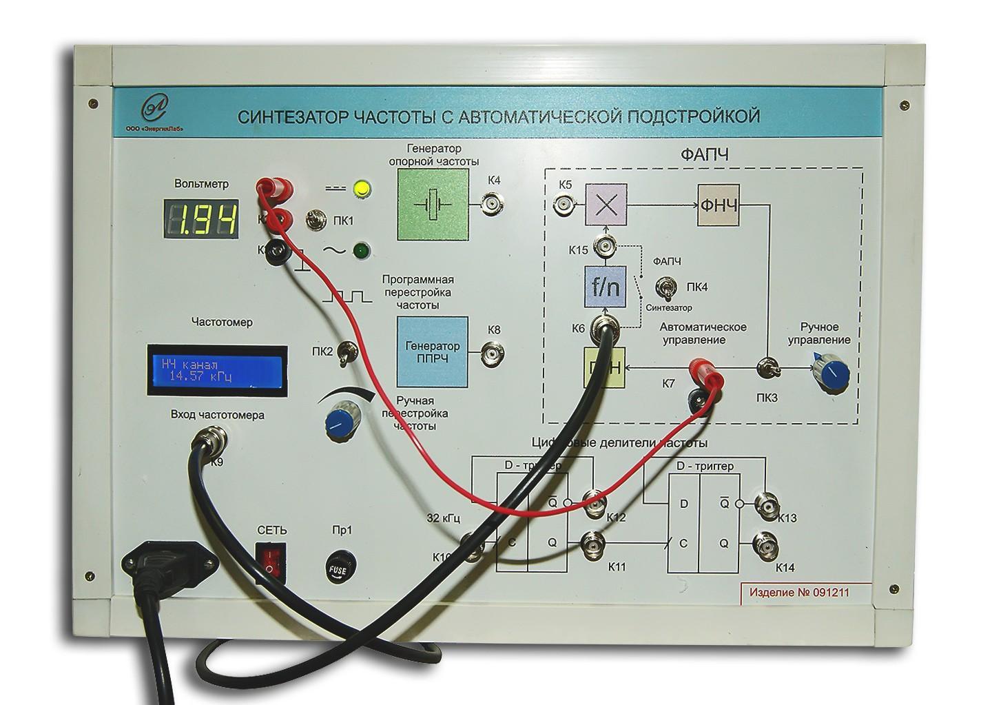 - Обеспечивает проведение эксперимента по теме «Автоматическая подстройка частоты» учебного лабораторного практикума радиотехнических специальностей. Предназначен для изучения принципов построения схем синтезаторов частоты с АПЧ. Используется для постановки лабораторных работ и проведения практических и демонстрационных занятий по курсу «Радиоприемные и передающие устройства».