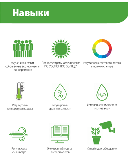 - Программирование необходимых параметров света, температуры, влажности, ветра, капельного полива в каждой микроклиматической зоне, создание и проведение отдельных проектов экспериментов путем создания цифровых программ в количестве не менее 40 одновременно.